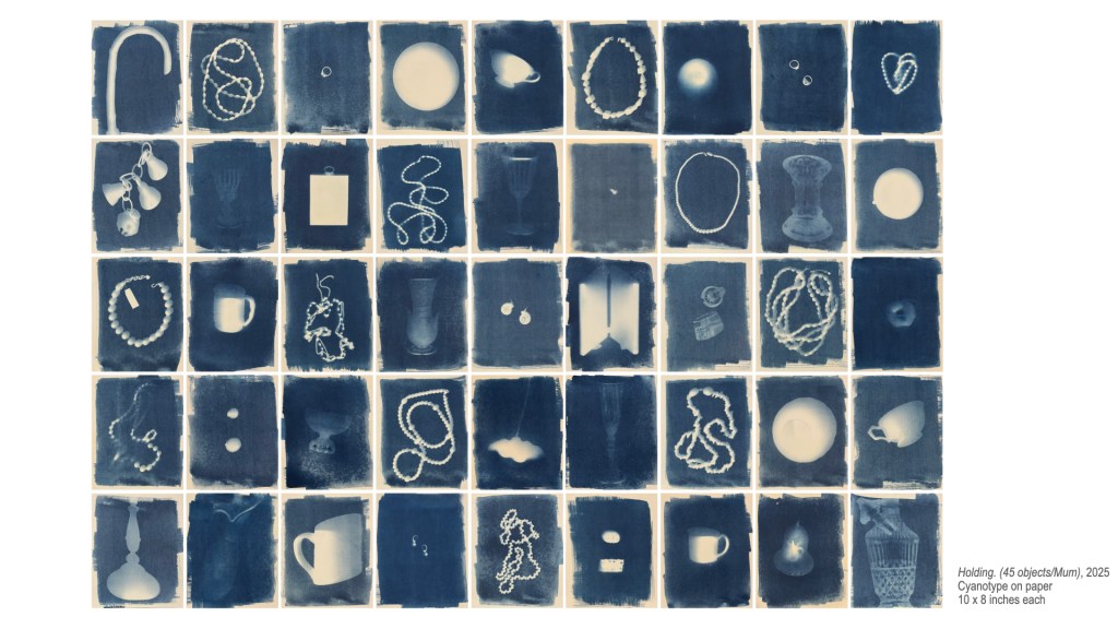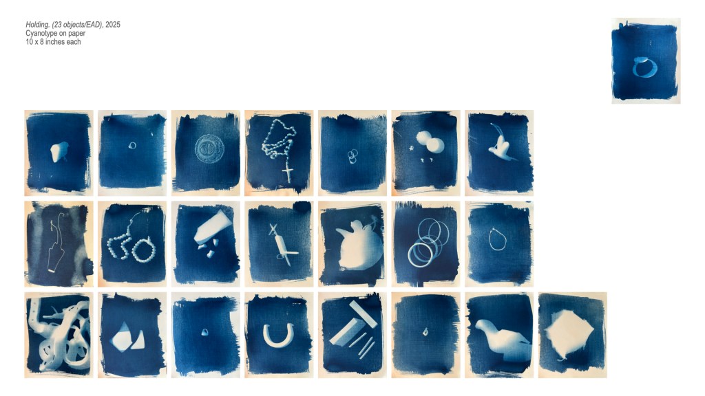 Inspired by cataloguing my mother’s objects, I began to not only think about the objects that we will leave for others, but those we carry with us from place to place—the objects that always make the move. I’m interested in documenting these objects through the cyanotype photographic process, not only as portraiture but as a reference to time, history, and the importance of the objects we hold on to. (2025 — ongoing)