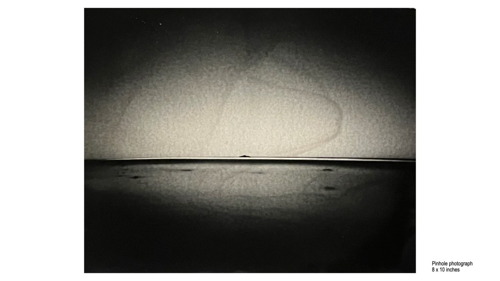 Through working on this sequence, I began to think about the horizon line. It’s made its presence through much of my work—the actual landscape horizon line. It’s a reference point that I’ve felt necessary to locate myself and the viewer within my abstract work. It is often dead center, like a flat-line. I’m particularly fascinated by how the pinhole camera renders the horizon line and was delighted to receive the following image that shows the natural slight arc.