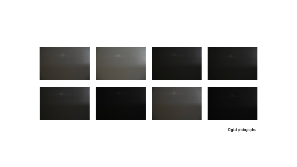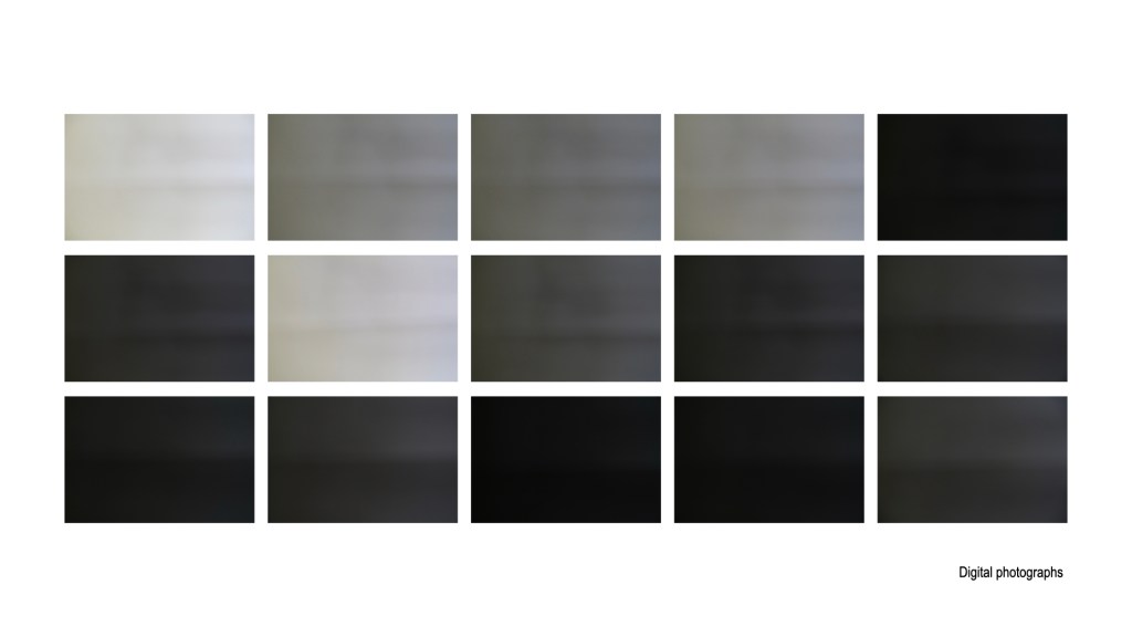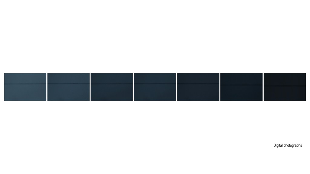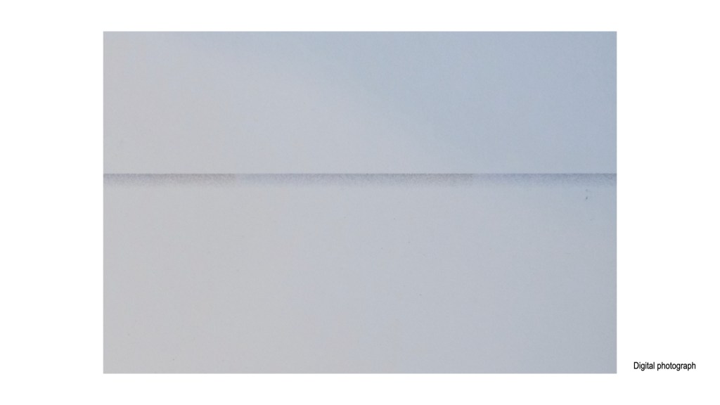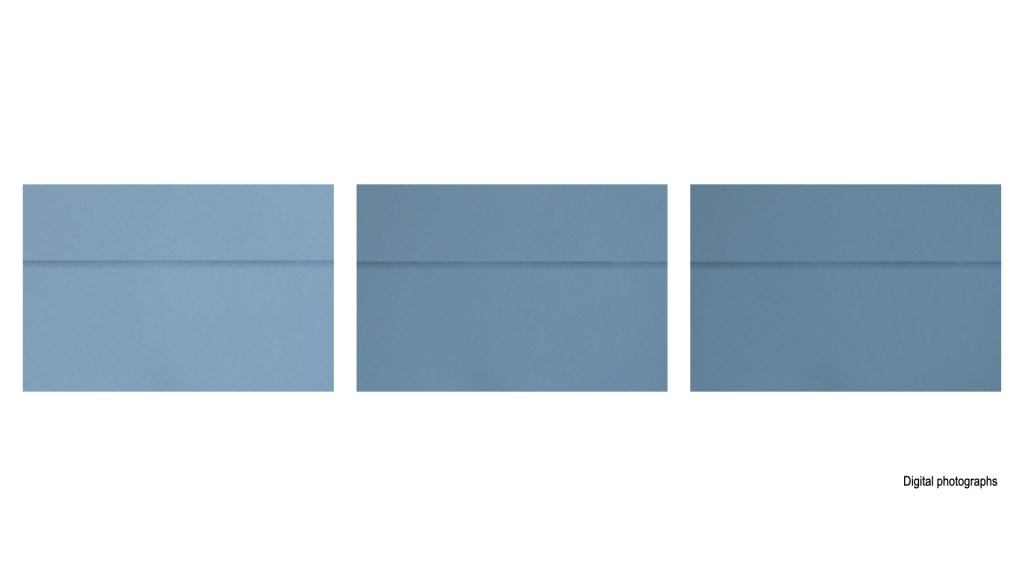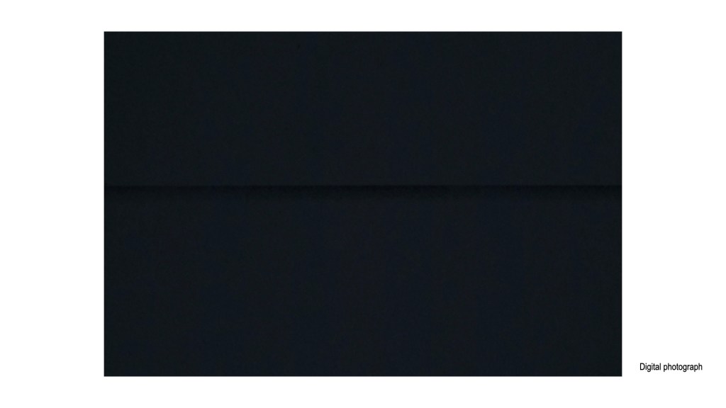Thinking about the different colors that the digital sensor creates in response to an object on a white background, I thought I would play with that idea and create images of a strip of white paper with a line of black ink residue—a glitch horizon. I zoomed in on this faux horizon line and adjusted the exposures repeatedly to see what the sensor would pick up. Surprisingly, the images revealed a blue cast.