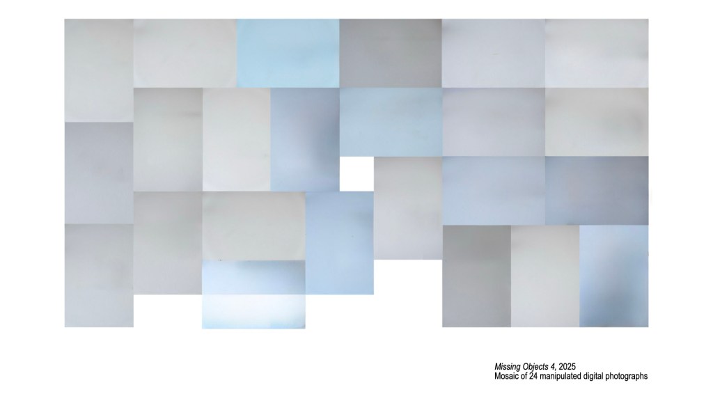 At the time, I was also practicing with the digital camera. I happened to photograph a set of objects and collaged them into a grid format. Again, what was most interesting to me, in the results, was the way the digital camera’s sensor emitted its own colored ground, so to say, based off of each object when placed on a white background. So, in Photoshop, I used the remove tool to remove the objects.